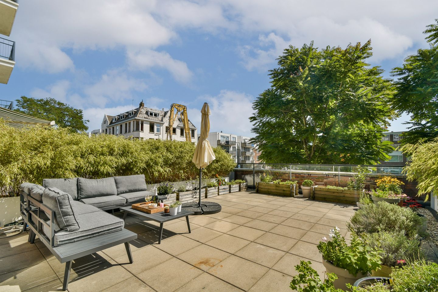 Liefhebbers van het buitenleven kunnen hun hart ophalen aan het terras aan de voorkant, maar de kers op de taart bevindt zich aan de áchterzijde van het complex: een waanzinnig privédakterras van maar liefst 38 m². Perfect voor een gezellige borrel in de namiddag of een ontspannen diner in de buitenlucht. Dankzij de beschutte ligging is dit dé plek om in alle rust van het buitenleven te genieten. Dit zonnige terras is bereikbaar via de hal en biedt zeeën van ruimte voor bijvoorbeeld een grote eettafel, loungehoek en meerdere zitplekken.