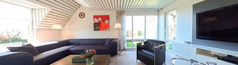 Woonkamer met open haard en verschillende raampartijen waardoor er een panoramisch uitzicht is over de Rotte. Onder de woonkamer bevindt zich een zeer grote bergruimte.