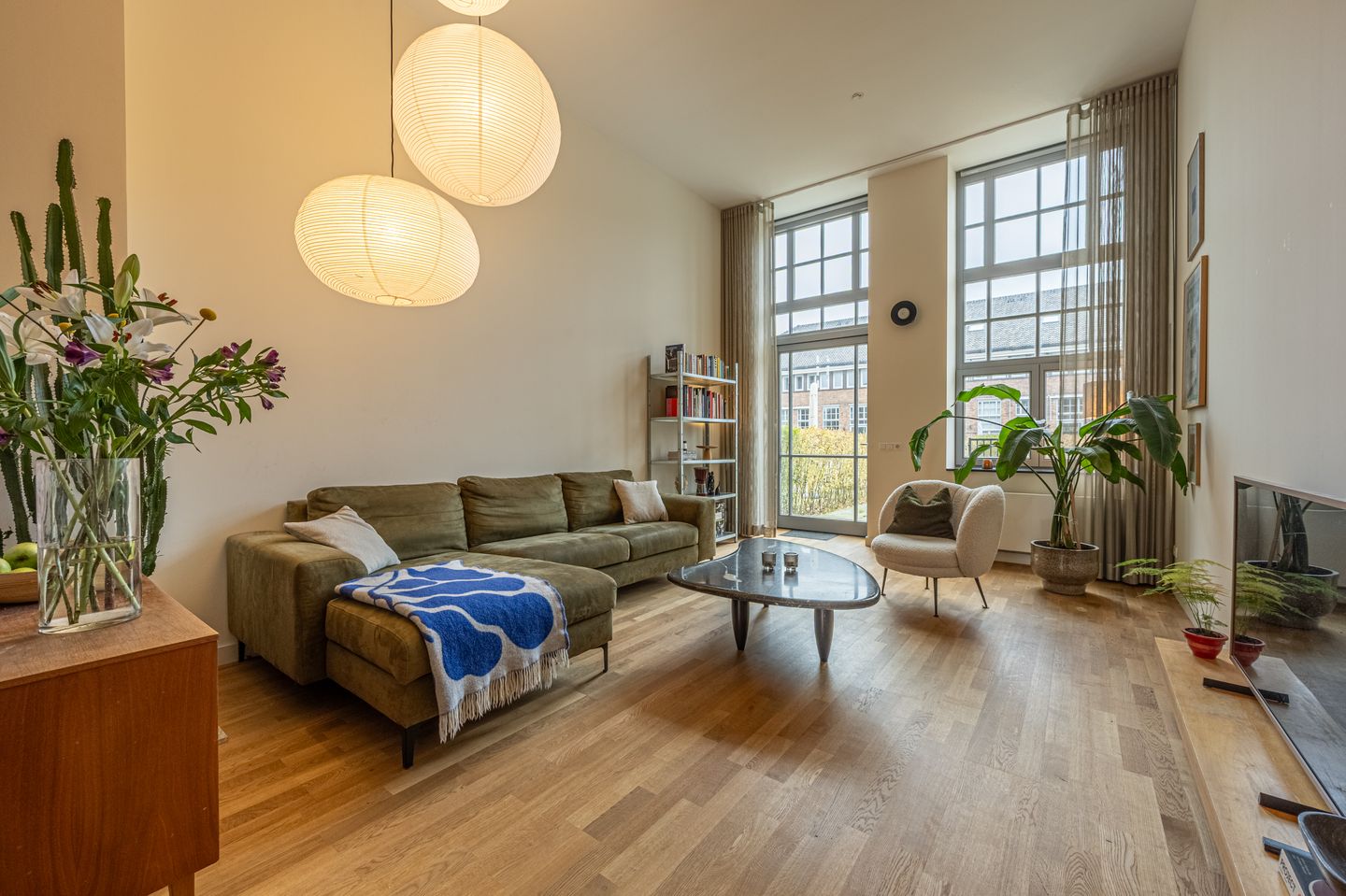 Aan de tuinzijde ligt de zitkamer, voorzien van eiken vloerdelen en een indrukwekkend hoog plafond dat direct een gevoel van ruimte en licht creëert. Hier vind je ruimte voor een comfortabele zithoek. Via de deur aan de achterzijde stap je de achtertuin in en is er toegang tot de gemeenschappelijke binnentuin.