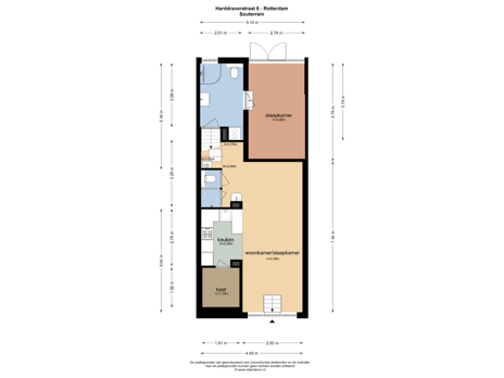 Het voorste gedeelte van het souterrain heeft een eigen entree vanaf de straatkant aan de voorzijde. Dit gedeelte is verrassend ruim en praktisch ingedeeld en volledig geïsoleerd. Indeling als volgt: woon-/slaapgedeelte, compleet ingerichte open keuken in hoekopstelling met bar, douchecabine, wastafelmeubel, separaat toilet, wasmachineaansluiting, bergkasten. Het geheel is voorzien van een eigen CV-ketel en eigen nutsverbruikmeters. Daarnaast geeft de keuken toegang tot een extra opslagruimte.