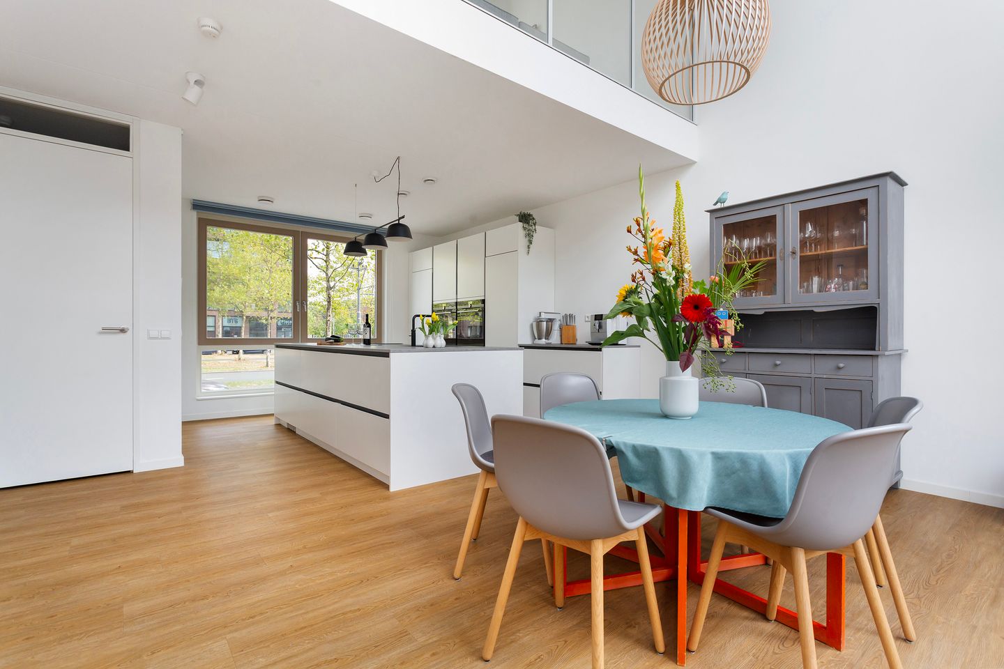 Wow, wat een ruimte en licht! Door de gigantische raampartijen, die doorlopen tot aan het plafond van de eerste verdieping, stroomt het daglicht volop naar binnen. Je komt binnen in de royale woonkeuken, waar plek is voor een grote eettafel én een fijne zithoek. De strakke keuken is echt een plaatje, met een royaal kookeiland dat perfect is voor lange avonden koken en tafelen. Alles voelt licht en luxe aan.