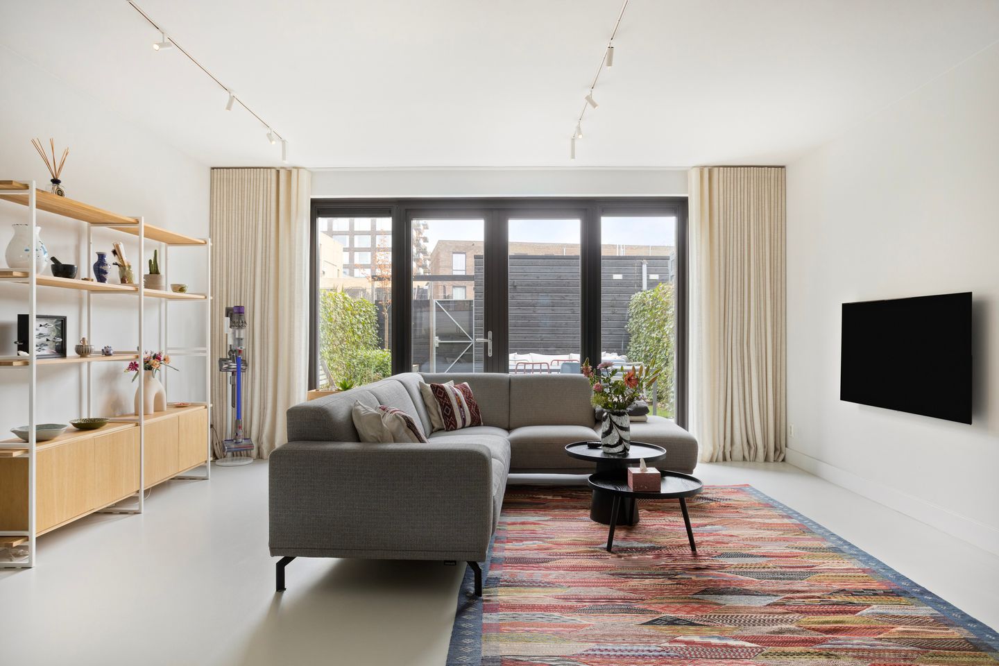 De openslaande deuren verbinden de woonkamer met de fraai aangelegde achtertuin (ca. 45 m²). Dankzij de slimme indeling met bamboehouten vlonders, kunstgras en tegels geniet je hier van zon én schaduw, met minimaal onderhoud en maximaal comfort.