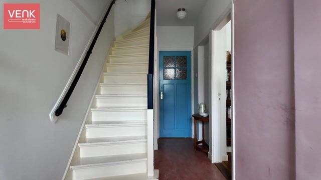 You arrive at the house beneath a charming archway in a porch, where you are sheltered before opening the front door. Upon entering, you step into a spacious hall that immediately provides a welcoming feeling. Here you will find a practical wardrobe and/or storage cupboard, a toilet with washbasin, and the staircase to the upper floors.