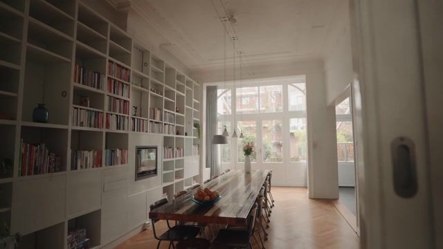 achterkamer (circa 7.80 x 3.84 m) voorzien van op maat gemaakte boekenkast met ingebouwde gashaard en openslaande deuren naar het terras.