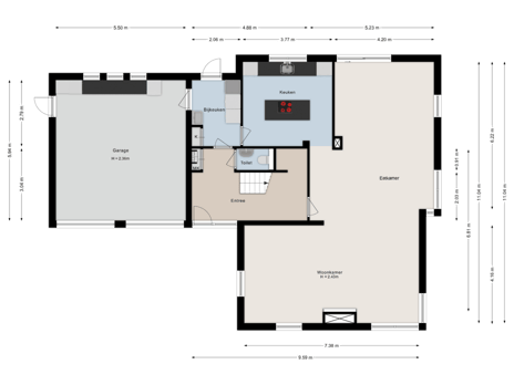 Via de ruime entreehal betreedt u de woning. In de hal bevinden zich de meterkast, een toilet en een vaste kast. Vanuit hier loopt u door naar de royale woonkamer, ingedeeld in een gezellige zithoek en een eetgedeelte. Dankzij de grote raampartijen heeft u vanaf de eethoek een prachtig uitzicht over de tuin en geniet u van volop daglicht. De eetkamer staat in open verbinding met de halfopen keuken, die in 2010 is vernieuwd. De keuken beschikt over een modern kookeiland en is uitgerust met diverse inbouwapparatuur, waaronder een vaatwasser op hoogte, inductiekookplaat, twee combimagnetrons, Quooker en koelkast. Aangrenzend bevindt zich de praktische bijkeuken met aansluitingen voor witgoed. Vanuit de bijkeuken heeft u direct toegang tot de aangebouwde stenen garage, voorzien van twee elektrische deuren, ruimte voor twee auto’s én een werktafel.