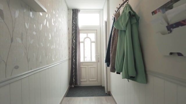 begane grond: hal met trapopgang, ruime sfeervolle woonkamer (806x614/395) met erker en hoge raamkozijnen waardoor heldere lichtinval, kelderkast, halfopen keuken (406x290) voorzien van in 2023 geplaatste moderne hoekinbouwkeuken met complete apparatuur. Voorts badkamer (290x202) voorzien van ligbad, douchecabine en badmeubel, bijkeuken (244x165) met opstelplaats voor wasmachine/droger, garderobe en bijvoorbeeld Amerikaanse koelkast of vriezer, portaal met toiletruimte en toegang tot de schuur. De begane grondvloer is in de woonkamer en hal voorzien van een pvc vloer met vloerverwarming, de wanden zijn afgewerkt met stucwerk.