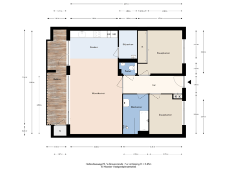 Wanneer u het appartement binnenstapt, komt u eerst in de ruime, langgerekte hal die toegang biedt tot alle vertrekken. Direct links vindt u de meterkast en vanuit de hal heeft u toegang tot alle vertrekken. Loopt u rechtdoor, dan bereikt u de lichte en ruime woonkamer. Aan de linkerzijde bevindt zich de zithoek, die dankzij de grote raampartij aan de balkonzijde profiteert van veel natuurlijk licht. Via deze raampartij heeft u toegang tot het brede balkon aan de straatzijde, welke gunstig is gelegen en is voorzien van elektrisch bedienbare zonwering.
