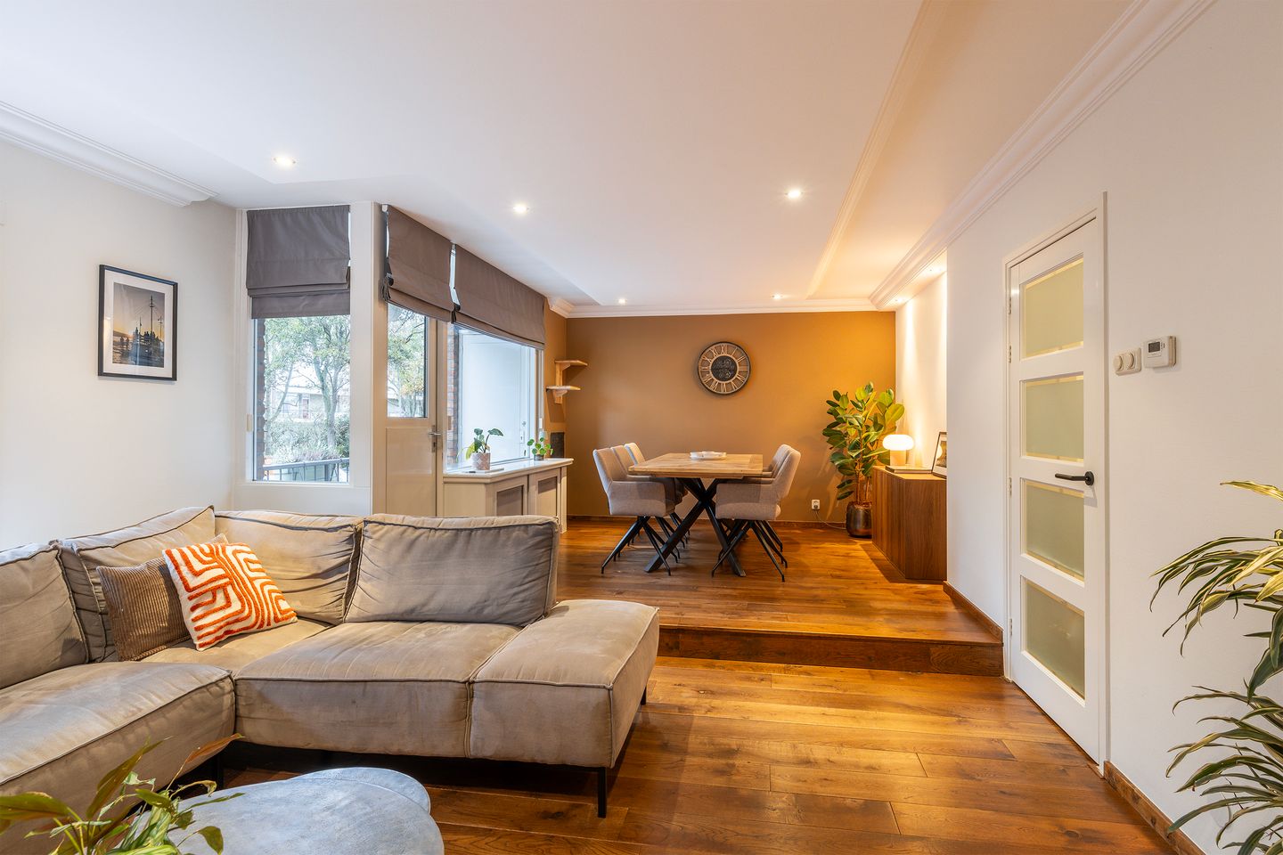 De woonkamer, gelegen aan de achterzijde, is verrassend ruim en heerlijk licht door de grote raampartijen. De ruimte is strak afgewerkt met glad gestuukte wanden, een verlaagd plafond met inbouwspots en sierlijsten. Wat direct opvalt, is de prachtige eikenhouten vloer die in de hele woning is doorgelegd, deze zorgt voor een warme uitstraling en vormt een stijlvol contrast met de strak afgewerkte wanden. Door het subtiele hoogteverschil is de woonkamer opgedeeld in twee delen: een gezellige zithoek met plek voor een ruime hoekbank en een hoger gelegen eetgedeelte waar u fijn kunt tafelen met uitzicht op het balkon. Vanuit hier stapt u via de loopdeur naar het balkon, voorzien van houtlook terrastegels en voldoende ruimte voor een gezellig zitje. Een heerlijke plek om van het zonnetje te genieten!