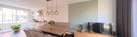 Dankzij de gunstige (zon)ligging en de grote ramen geniet de woonkamer van veel natuurlijk licht en een prettig uitzicht op de tuin.