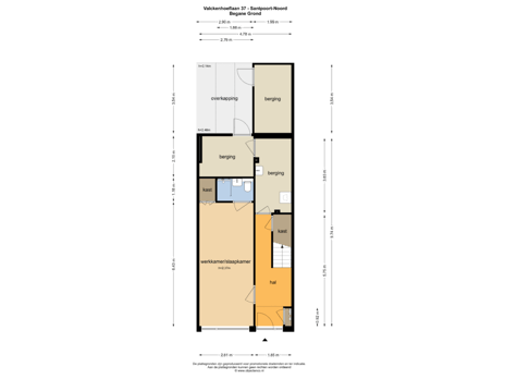 Parterre: entree, meterkast, zeer ruime hal met trapkast; grote en lichte werk/slaapkamer aan de voorzijde met grote inbouwkast en eigen badkamer voorzien van inloopdouche, wastafel en toilet; ruime wasruimte/bijkeuken met opstelling van wasmachine/droger; toegang tot de inpandige bergruimte met deur naar achtererf middels roldeur; carport en buitenberging met roldeur.