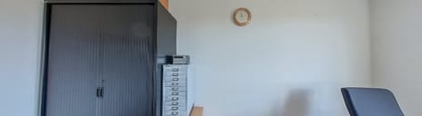 Naast de keuken ligt een ruime kamer welke thans in gebruik is als kantoor. Een grote schuifpui met Frans balkon zorgt hier voor lichtinval. In deze kamer is ook een wastafel.