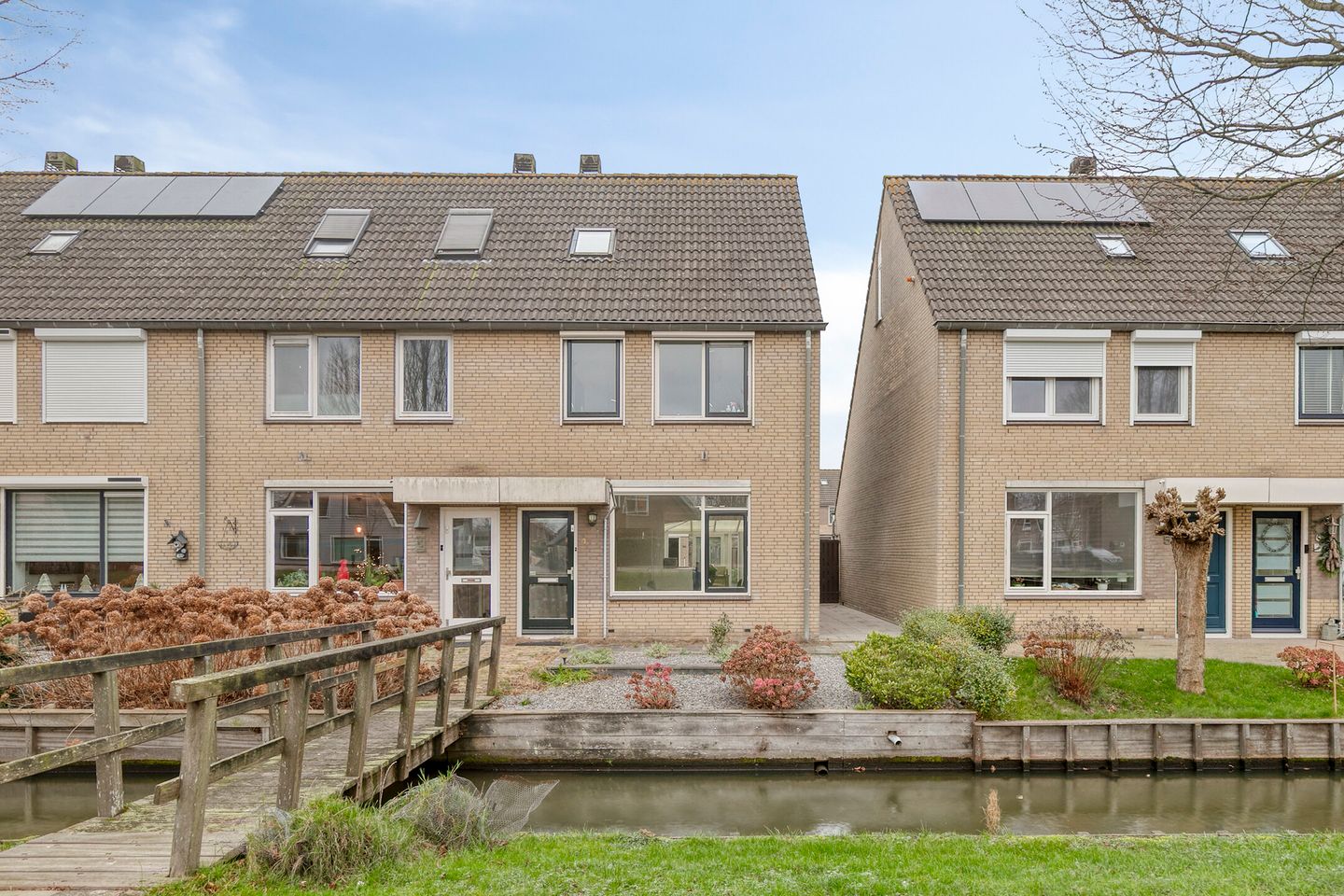 U bereikt de woning aan de voorzijde via een charmant bruggetje over het water. In de straat is voldoende parkeergelegenheid aanwezig. Eenmaal binnen komt u in de hal, die toegang biedt tot de woonkamer. Een tweede, centraal gelegen hal leidt naar het toilet en de trap richting de eerste verdieping.