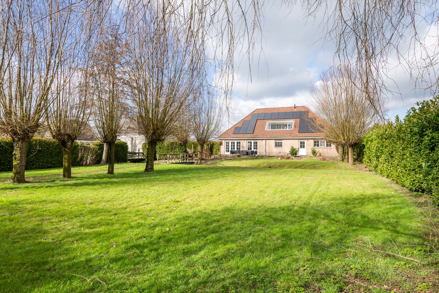 De villa ligt op een perceel van 1.536 m², omgeven door een landelijke tuin met waterpartijen en een bruggetje. Aan de voorzijde vind je een rustige straat met parkeerruimte en uitzicht over de landerijen. Een perfecte oase van rust voor de levensgenieter!