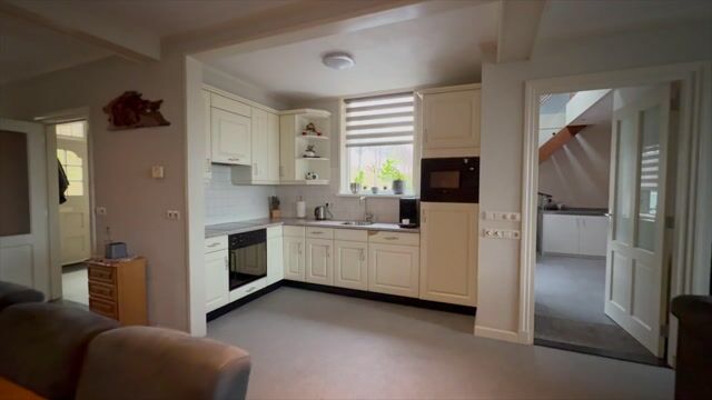 Entree via de bijkeuken – die in verbinding staat met de garage en woonkamer –. Natuurlijk kun je ook gewoon gebruikmaken van de voordeur, die uitkomt in de 'oorspronkelijke' hal. De ruime, uitgebouwde woonkamer met open keuken is erg licht en heeft tuindeuren aan de achterzijde. De grindvloer geeft karakter en de houtkachel zorgt voor gezelligheid sfeer. De open keuken maakt het plaatje compleet. Die is praktisch ingedeeld in een hoekopstelling en voorzien van de nodige inbouwapparatuur. En dan dat uitzicht… je kijkt zo de polder in. Echt zo’n plek waar je tot rust komt.