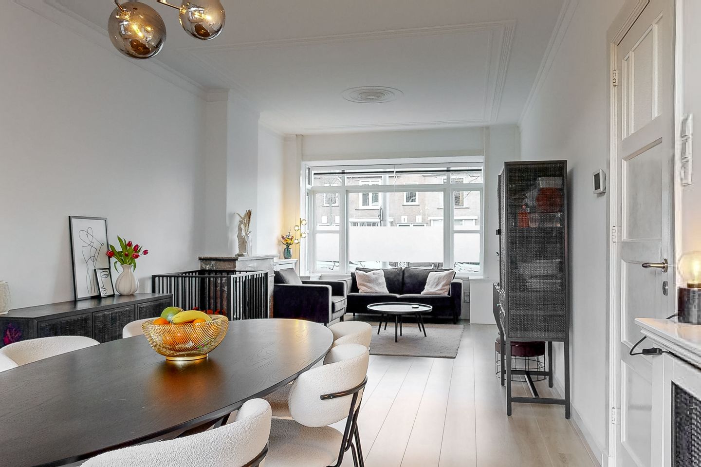 De royale woonkamer ademt sfeer door de hoge ornamenten plafonds, de klassieke erker en de warme vloerafwerking. Openslaande deuren geven toegang tot de heerlijke tuin.