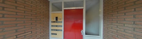 Afgesloten portiek met bellentableau, intercom en brievenbussen. Trap naar de verdiepingen.