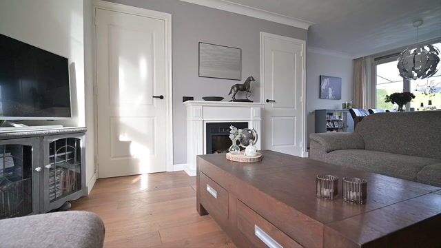 Via de hal kom je binnen in een verzorgde entree met toiletruimte, meterkast en toegang tot zowel de garage als de woonkamer. De woonkamer is prettig en licht, dankzij de grote ramen aan de voor- en achterzijde. De houten vloer en de praktische provisiekast zorgen voor comfort en sfeer.