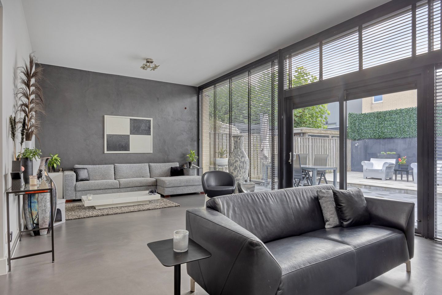 Via de hal stap je binnen in de lichte en moderne woonkamer. Grote raampartijen, hoge plafonds en een strakke betongietvloer met vloerverwarming zorgen voor een ruimtelijk en eigentijds geheel. De brede schuifpui verbindt de woonkamer met de zonnige tuin. De royale living biedt plaats aan meerdere zithoeken, terwijl bij de keuken ruimte is voor een grote eettafel – ideaal voor gezellige diners en lange avonden tafelen. Aan de voorzijde bevindt zich de moderne open keuken met kookeiland en een hardstenen werkblad. De keuken is compleet uitgerust met o.a. een inductiekookplaat met Bora-afzuigsysteem, spoelbak met Quooker, wijnkoelkast, vaatwasser, koelkast en een grote heteluchtoven. Grenzend aan de woonkamer ligt de bijkeuken met aansluitingen voor wasapparatuur en de cv-installatie. Vanuit hier bereik je de nette, voormalige garage: een multifunctionele ruimte die uitstekend kan dienen als kantoor of praktijk aan huis. Daarnaast is er nog een extra berging naast de woning, eveneens netjes afgewerkt. Deze ruimte kan eenvoudig worden ingericht als kantoortje of bijvoorbeeld als sfeervolle tuinkeuken.