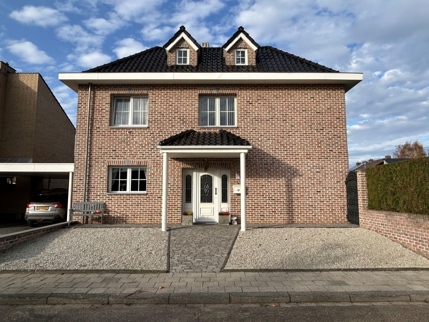 Voortuin met statige entree met overkapping, bestrating, siergrind en deur naar zij-tuin.