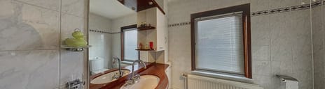 Via de trap in de hal bereik je de eerste verdieping. Hier bevinden zich drie ruime slaapkamers. Allen ruim genoeg voor een tweepersoonsbed en een bureau. De twee centrale slaapkamers zijn voorzien van inbouwkasten en de derde slaapkamer biedt tevens nog genoeg plaats voor een kledingkast, dankzij de opbouw. Ook biedt het toegang tot het balkon naast de woning. Tevens treffen we op deze verdieping nog de tweede badkamer aan met een douche, wastafel met meubel en een toilet.
