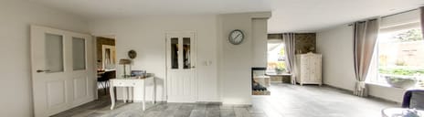 Via de uitnodigende entree is er toegang tot een ruime ontvangsthal met garderobe, meterkast, keurige toiletruimte met zwevend toilet en fonteintje, de trapopgang naar de eerste verdieping en de toegang tot de woonkamer. Deze zeer riante L-vormige woonkamer kenmerkt zich door de vele lichtinval, de open uitstraling en het directe tuincontact dankzij de openslaande deuren. De sfeervolle gashaard maakt deze ruimte helemaal compleet.
