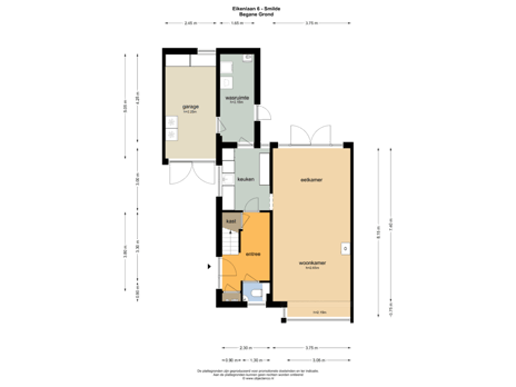 Begane grond: entree/hal, toilet, de trapopgang naar de eerste verdieping en de trappenkast voor extra opbergruimte. Vanuit de hal stap je de keuken in, deze is uitgerust met een koelkast, een gasfornuis, vaatwasser, afzuigkap en een combi-oven. De keuken heeft een doorgang naar de bijkeuken, waar je de opstelling wasmachine en de CV-ketel vindt. De bijkeuken heeft een deur naar de achtertuin en biedt binnendoor toegang tot de garage.