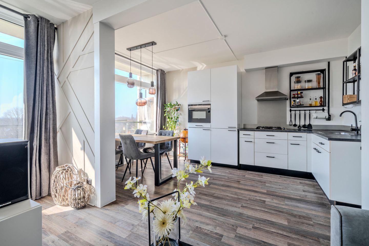 Appartement (6e verdieping): De hal biedt ruimte aan een meterkast, een grote nieuwe inbouwkast en een extra stopcontact. De lichte woonkamer met grote ramen geeft toegang tot het zonnige balkon met een handige balkonbar en barkrukken, perfect voor een drankje met vrij uitzicht. De open keuken is modern en uitgerust met een combinatie magnetron-oven, koel-vriescombinatie, 4-pits gasfornuis en afzuigkap.