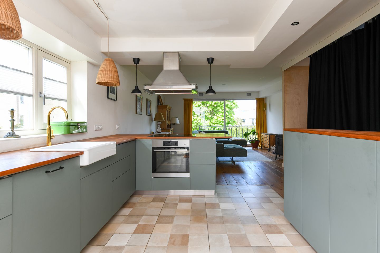 Op de eerste verdieping vind je een sfeervolle woonkamer met open keuken. Dankzij de open indeling, de grote ramen en de balkons aan zowel de voor- als achterzijde is het een lichte en gezellige ruimte. Het balkon aan de achterzijde heeft bovendien een trappetje naar de tuin, zodat je gemakkelijk van binnen naar buiten kunt lopen.