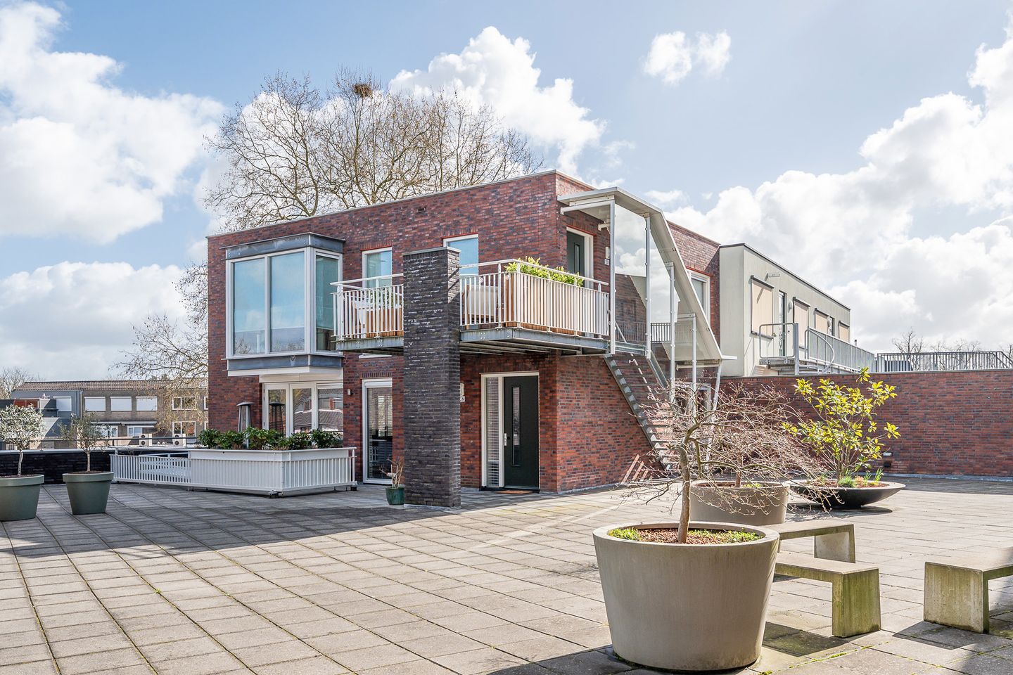 Dakterras: Fraai dakterras (± 16 m²) met bloempotten, bloembakken, terrasverwarmer en zicht op het achtergelegen binnenterrein.