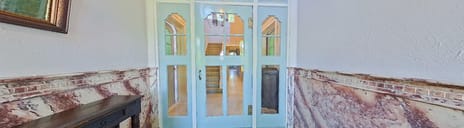 Upon entering through the grand main entrance with its marble wainscoting, the original mosaic floor featuring the Rod of Asclepius immediately reveals the home’s medical heritage. The vestibule opens onto a hallway that divides the villa into two symmetrical wings. Under an elegant arch adorned with a marble floor hangs a striking Art Nouveau lantern.