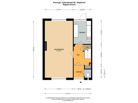 Entree met garderobe en trapopgang; toilet; woonkamer van het type 'doorzonkamer'; keuken met doorgang naar de achtertuin.