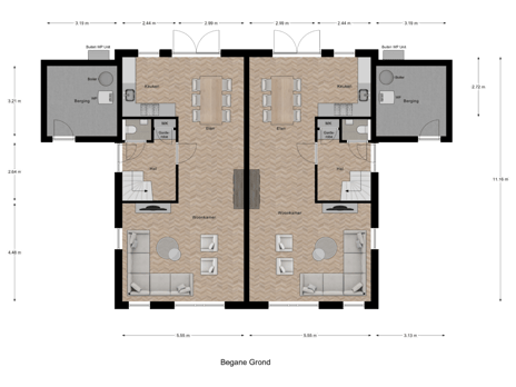 Via de zijentree komt men in de ruime hal voorzien van een toiletruimte, meterkast en vaste trap naar de eerste verdieping. De royale woonkamer heeft een lengte van circa 11 meter en biedt veel lichtinval. De woonkamer bevindt zich aan de voorzijde en aan de achterzijde is de ruime keuken gesitueerd, uitgerust met openslaande tuindeuren die zorgen voor een optimale verbinding met de tuin. Verder is de buitenberging van circa 10 m² vanaf de oprit bereikbaar. Er is voldoende ruimte op eigen oprit voor twee parkeerplaatsen.
