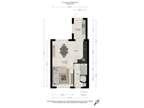 Direct aansluitend vind je de bijkeuken, een bijzonder praktische ruimte met een keukenblok en veel kastruimte. Hier zijn de aansluitingen voor de wasmachine aanwezig, evenals water en elektra, plus een handige kleine boiler onder de kraan. Vanuit de bijkeuken stap je zo de achtertuin in, waardoor binnen en buiten op een natuurlijke manier met elkaar verbonden zijn.