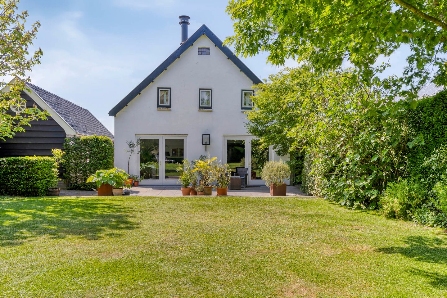 Aangelegde tuin, terras bestraat met sierbestrating en voorzien van een overkapping vv. buitenhaard, tuinkas vv. beregeningscomputer en groentetuin vv. drinkwatertappunt, borders, gazon vv. beregeningsinstallatie en een zij-uitgang;