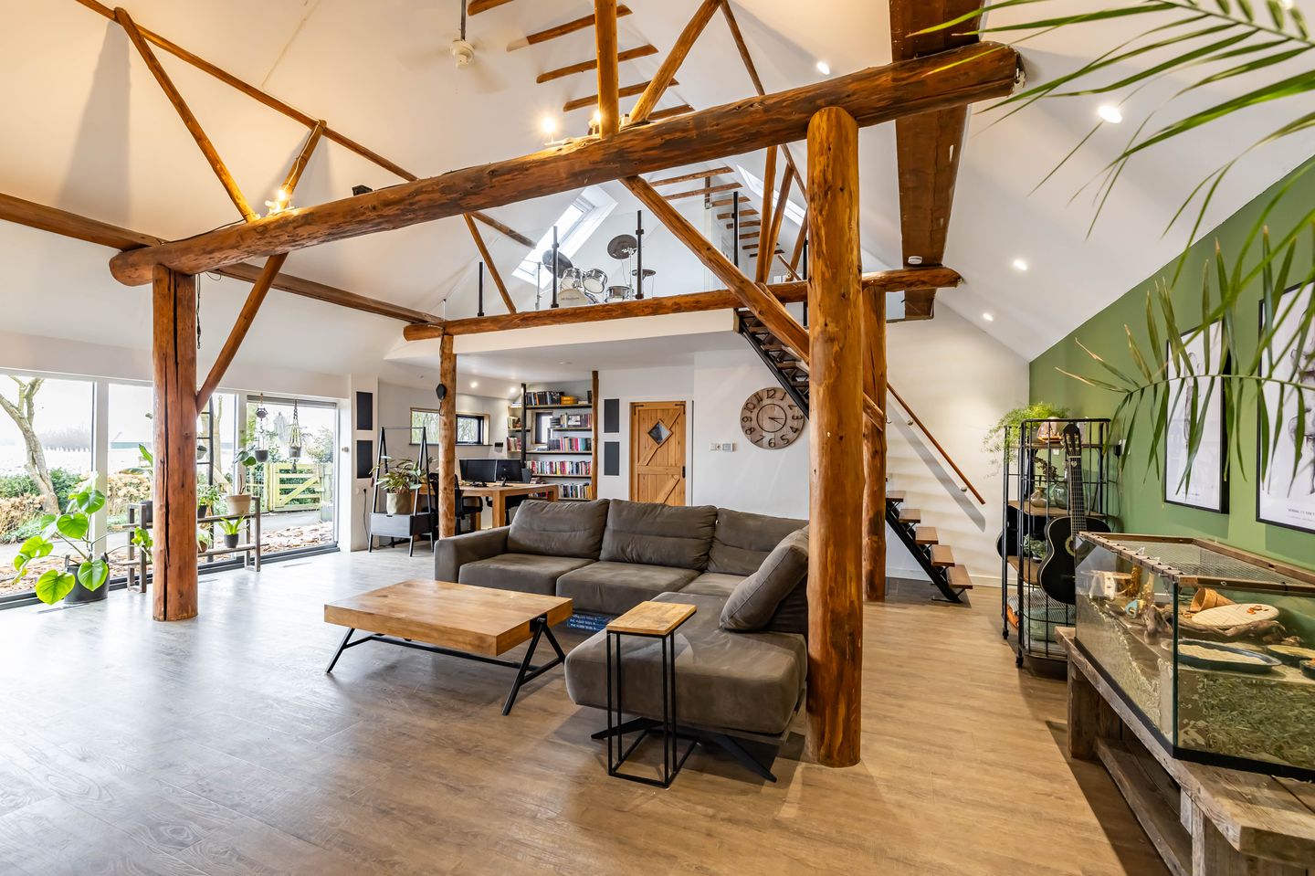De vide, pelletkachel en fraaie gebinten en balken in het zicht geven de woonkamer (62 m², pvc-vloer) een sfeervol geheel. Vanuit de woonkamer is er vanuit de grote raampartijen een fraai uitzicht over de landerijen. Via de tuindeuren is het terras te bereiken.