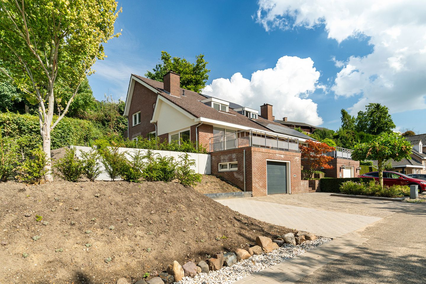 In de voortuin is een riante oprit gecreëerd voor vier auto’s, is onderhoudsvriendelijk afgewerkt en heeft een ruim zonneterras met prachtig uitzicht over het natuurgebied. De zijtuin is voorzien van een speelse indeling met twee terrassen, buitenhaard en opnieuw aangelegde borders.
