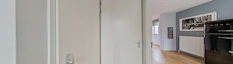 Houten vloer, dubbel openslaande deuren, radiator, trapopgang en trapkast.