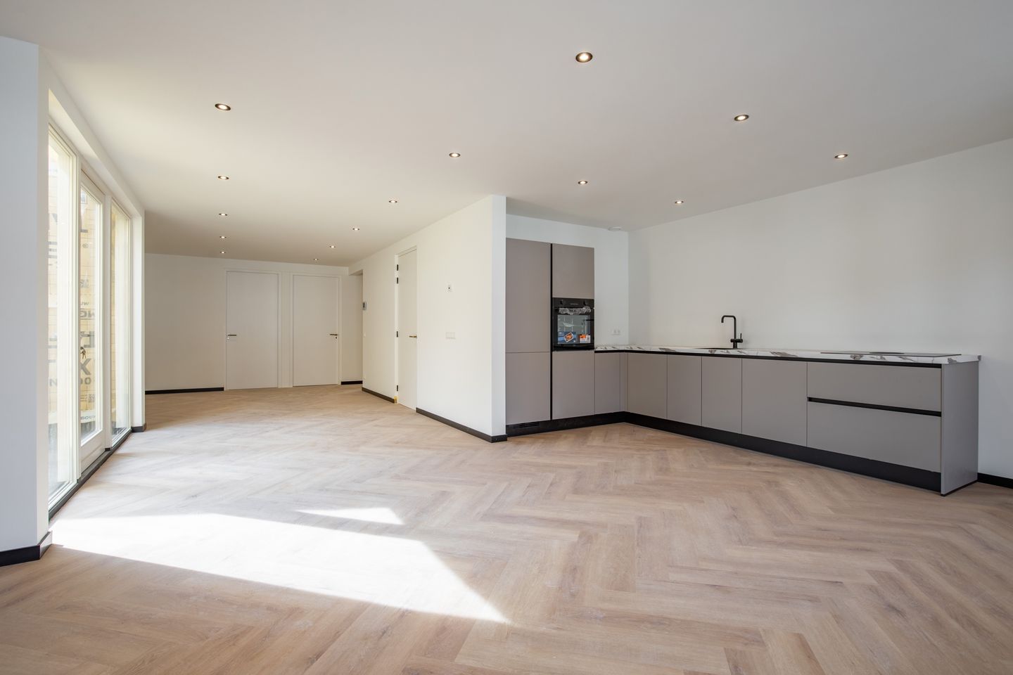 Dit appartement is heerlijk ruim met een woonoppervlakte van ongeveer 107 m² en ligt aan de achterzijde van het pand. De privé-hal biedt toegang tot de toiletruimte en de woonkamer. De woonkamer met open keuken is T-vormig en maar liefst ca. 61 m² groot en voorzien van een hoogwaardige PVC-vloer met een behaaglijke vloerverwarming.