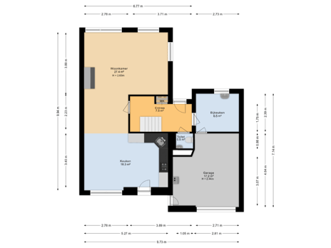Entree via een ruime hal met meterkast, die toegang biedt tot de lichte woonkamer met rookkanaal en een prachtig vrij uitzicht over de landerijen aan de voorzijde. De open keuken is voorzien van diverse inbouwapparatuur, waaronder een combimagnetron, koelkast, vaatwasser, kookplaat en afzuigkap. Vanuit de hal bereik je tevens de praktische bijkeuken met witgoedaansluitingen, uitstortgootsteen en een schuifdeur naar de garage. De garage is uitgerust met een elektrische deur, cv-opstelling en een deur naar de tuin, wat het geheel compleet maakt.