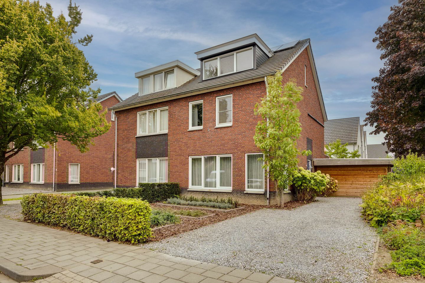 De voortuin is voorzien van fraai aangelegde borders en een oprit. De onderhoudsvriendelijke achtertuin beschikt over gazon, meerdere terrassen, speelvoorzieningen, diverse aanplant en een praktisch houten tuinhuis/berging.