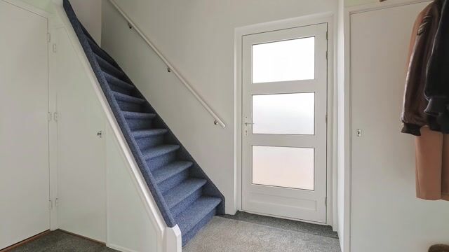 - De voordeur bevindt zich aan de zijkant van de woning en biedt toegang tot de hal. Hier bevindt zich een praktisch nisje voor de garderobe, meterkast, toiletruimte en trapkast. Ook is hier de trapopgang naar de eerste verdieping te vinden