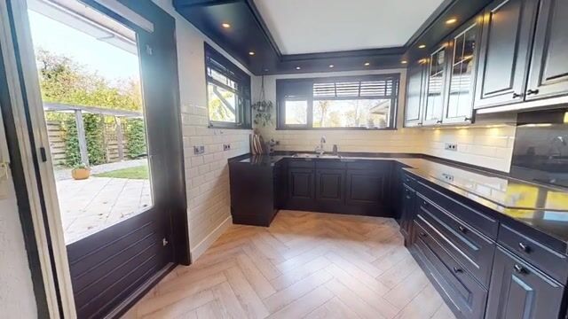 Bij binnenkomst in de hal valt direct de verzorgde uitstraling op. Vanuit hier bereik je de trapopgang, de meterkast en een modern toilet met fonteintje. De L-vormige doorzonwoonkamer voelt licht en ruim aan, met een sfeervolle sierhaard en een eethoek met prachtig uitzicht op de achtertuin. De zwarte U-keuken is van alle gemakken voorzien en biedt toegang tot de bijkeuken, die weer doorloopt naar de inpandige garage – ideaal voor fietsen, opslag of een extra werkruimte.