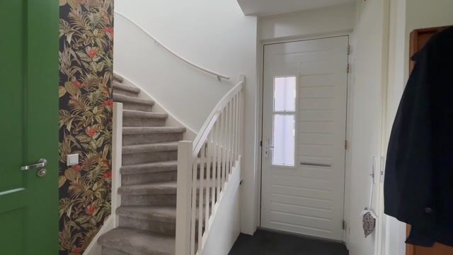 Hal/entree met de trapopgang, het toilet met hangcloset en fonteintje, de meterkast (8 groepen, 3 aardlekschakelaars, zonnepanelen groep, groep voor de laadvoorziening en glasvezelaansluiting) en deur naar de woonkamer.