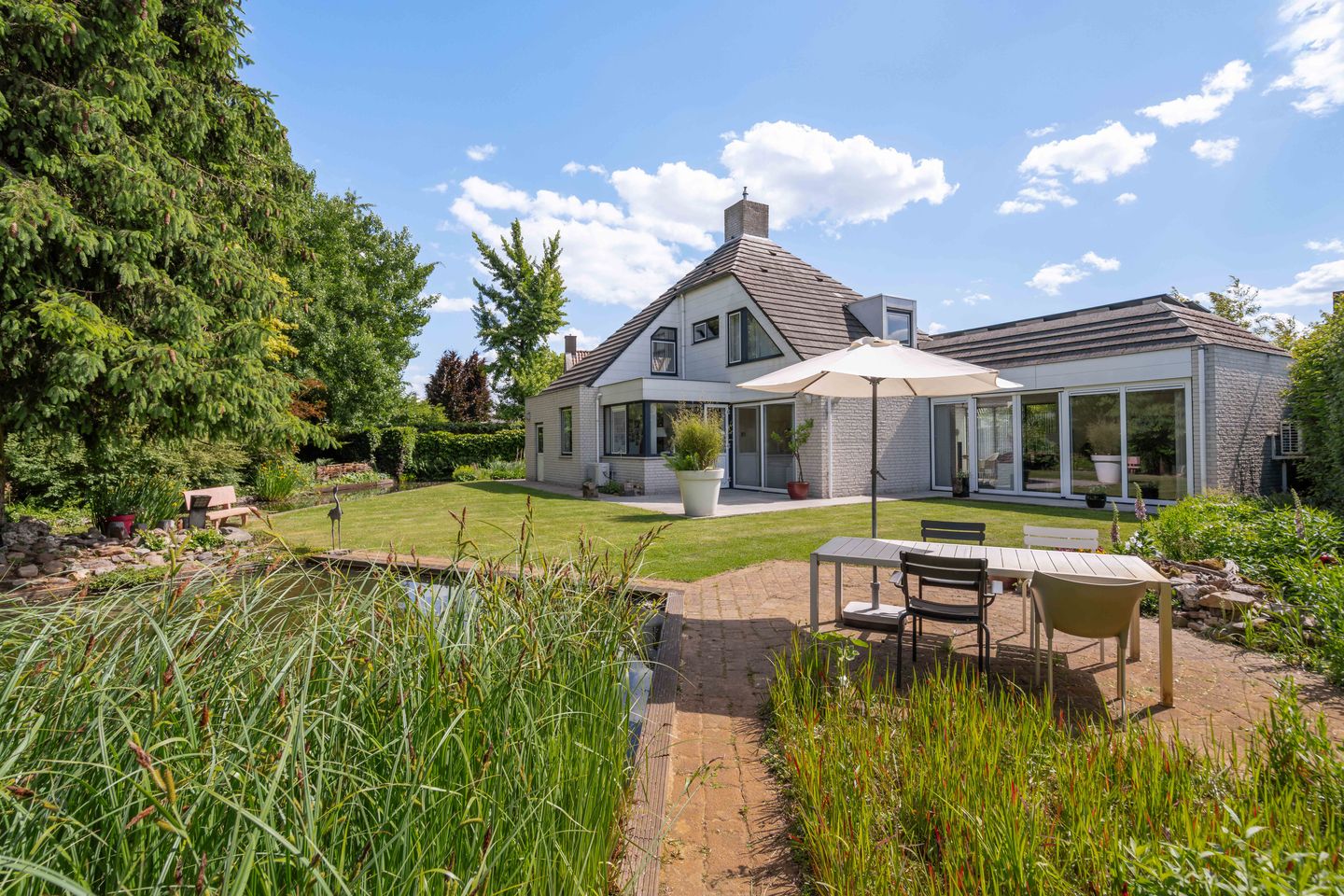 Vanuit de woonkamer, keuken en de bijkeuken is er toegang tot de tuin. De tuin is tevens toegankelijk via een achterom aan de rechterzijde van de woning. De tuin bestaat uit een betegeld terras aan de woningzijde, een groot gazon, een tweetal vijverpartijen en diverse borders met o.a. keien en volwassen bomen, planten en (bamboe)struiken. De tuin beschikt over een beregeningsinstallatie (2019) welke is aangesloten op een grondwaterpomp en is voorzien van een buitenkraan, elektra en verlichting. Aan de achterzijde bevindt zich een extra bestraat terras met een uitstekende zonligging. Via het extra terras is er toegang tot een omheind gedeelte met meerdere bamboestruiken. Het omheinde gedeelte is thans in gebruik als kippenren. Ter plaatse van het omheinde gedeelte bevindt zich de grondwaterpomp. Aan de achterzijde van de vijver bevindt zich een bloementuin (ca. 320 m2) met diverse hortensia's en varensoorten welke wordt gehuurd van de gemeente. Het totaal vormt een visueel geheel en werd in 2008 bekroond met de 1e prijs van Grote Ecologische Tuinen van Limburg. Achter de tuin bevindt zich het 'Lindepad'.