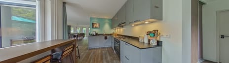 De luxe keuken is half-open, beschikt over bijzonder veel bergruimte en heeft diverse apparatuur waaronder een groot 5-pits gasfornuis, een Quooker, vaatwasser, koelkast-vriezer en oven.
