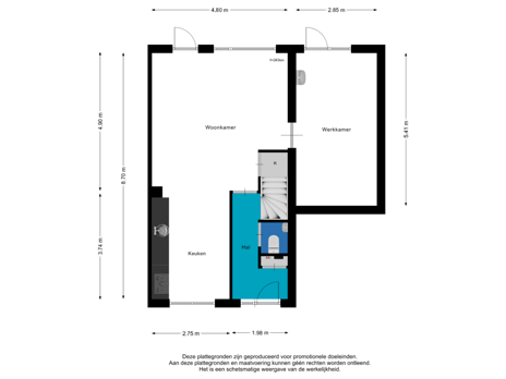 Entree/hal, meterkast, toiletruimte en trapopgang naar boven. De ruime woonkamer heeft veel lichtinval en is voorzien van een plavuizen vloer die doorloopt in de keuken. De keuken is praktisch ingericht in rechte opstelling met een 4-pits gasfornuis, spoelbak, vaatwasser en voldoende kastruimte. Onder de trap bevindt zich extra bergruimte.