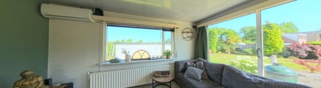 The main house features an entrance with a fantastic conservatory (33.4 m²) spanning the entire length of the house. This space has been transformed into a cozy seating area and a sports area. The conservatory leads into the kitchen and adjacent living room. The wood-burning stove creates a wonderfully warm atmosphere in the winter months. The long hallway leads to the two bedrooms and bathroom with bathtub.
