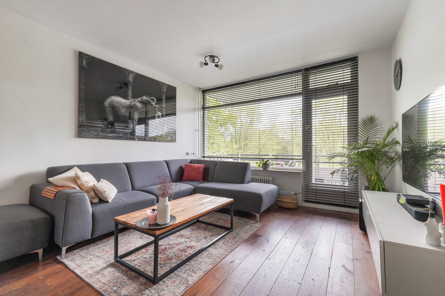 De royale en lichte woonkamer is keurig afgewerkt met een massief eikenhouten vloer en voorzien van grote raampartijen die zorgen voor een fijne lichtinval. Via de woonkamer heb je toegang tot het balkon met uitzicht op groen.