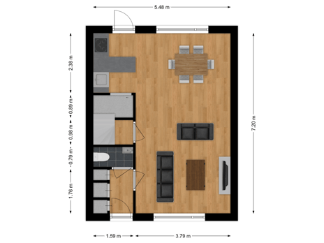 De ruime woonkamer is voorzien van een eikenhouten parketvloer, een airco-unit en rolluiken aan zowel de voor- als achterzijde.