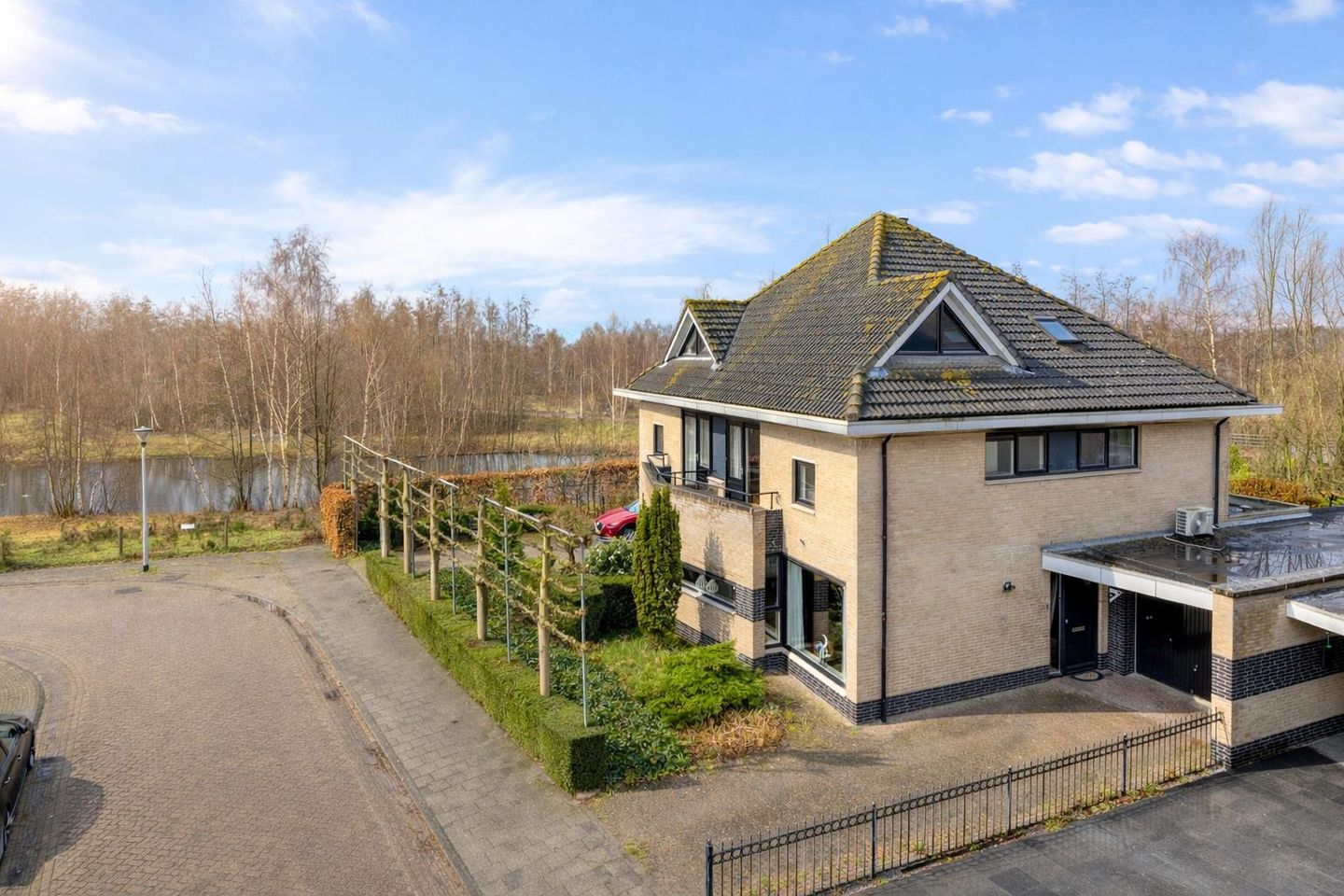 De voortuin is verzorgd aangelegd met leibomen, hortensia’s en groenblijvende beplanting. Samen met de ruime oprit geeft dit de woning een nette en uitnodigende uitstraling. Doordat er geen directe overburen zijn voelt de ligging hier extra open en ruim.